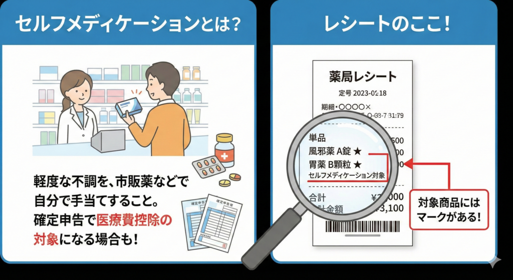 (※イメージ:緑色や青色のマークで「セルフメディケーション税・控除対象」などと書かれています)