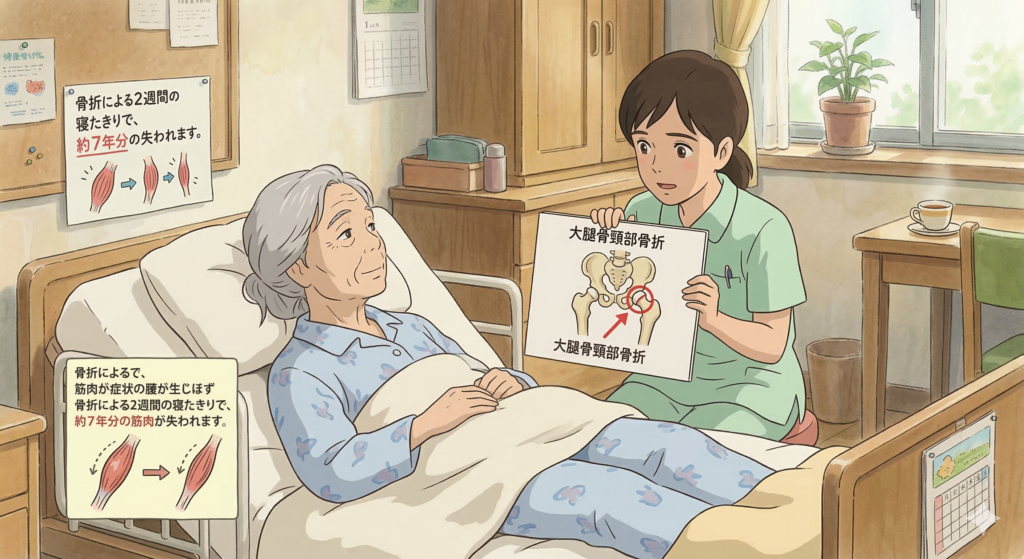 - ① 骨折・入院による「ベッド上での安静」 手術や治療のため、数日から数週間の寝たきり状態が続きます。