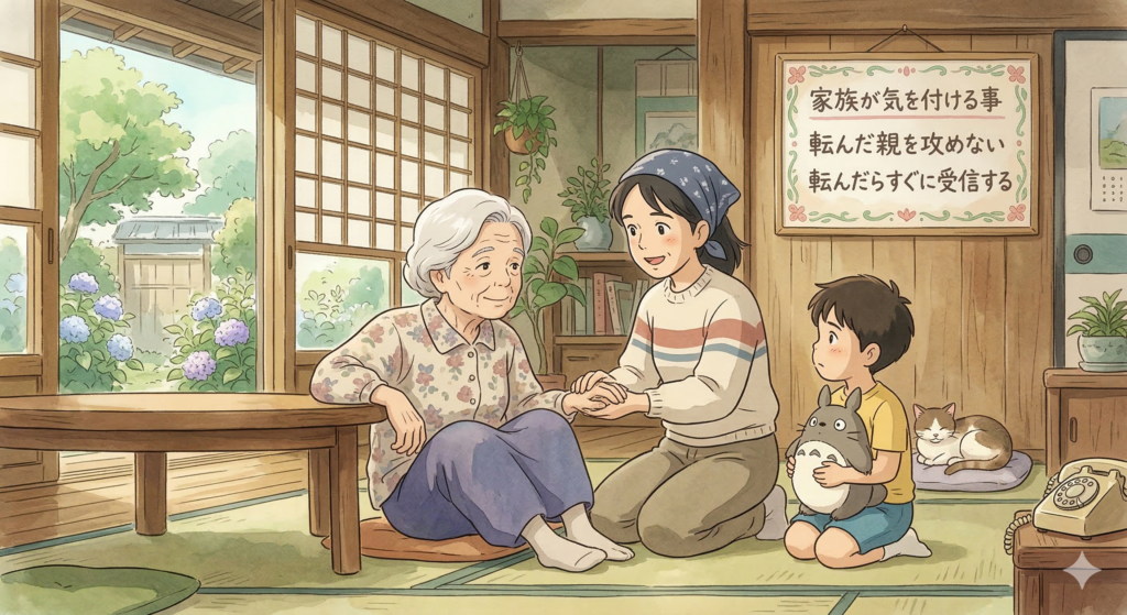 - 転倒した親を責めない: 万が一転んでしまった時、「だから気を付けてって言ったのに!」と責めるのはNGです、絶対にやめてください。本人が一番ショックを受けており、自信を喪失して引きこもりがちになってしまいます。まずは気持ちに寄り添いましょう。※ご自分に置き換えてみてください!